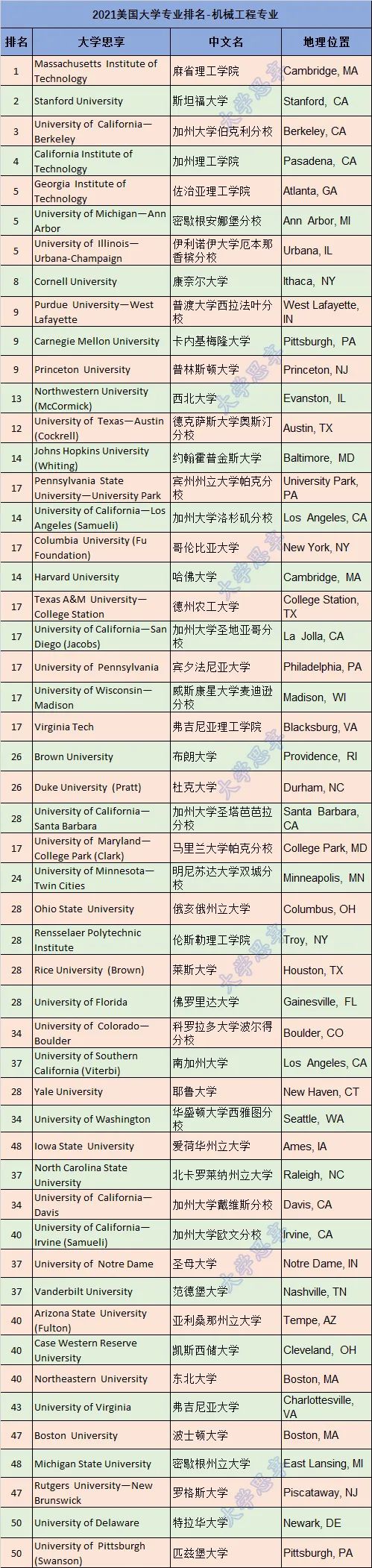 2016年usnews美国本科机械工程专业排名